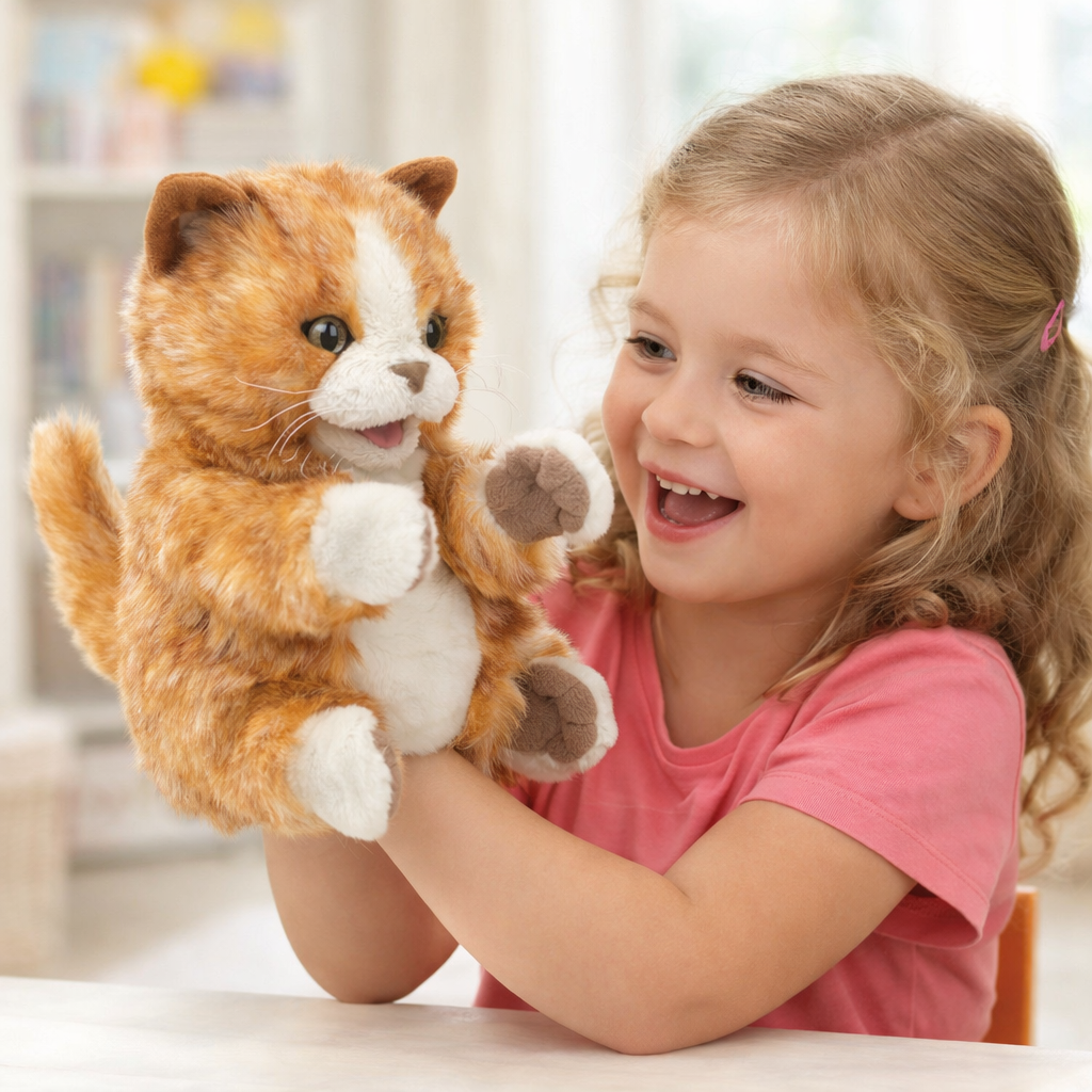 De Oranje-Bruine Kitten Handpop is een veelzijdige educatieve speelpop die leren en plezier combineert via interactief rollenspel en verhalen vertellen.