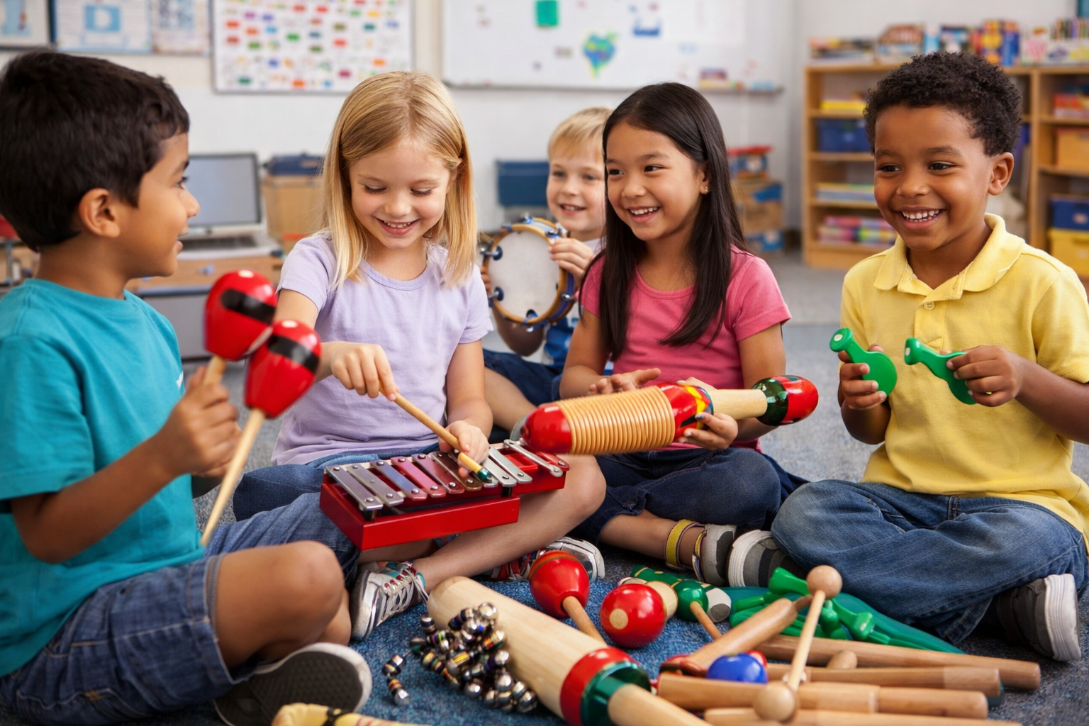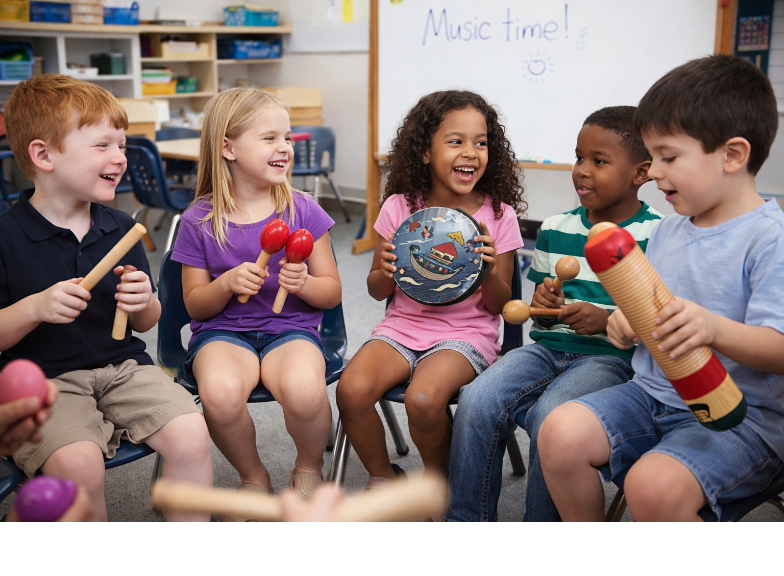 De grote variatie aan percussie-instrumenten stimuleert actief luisteren, ritmegevoel en muzikale expressie. Door te slaan, schudden en bewegen ontwikkelen kinderen hun fijne en grove motoriek, hand-oogcoördinatie en lichaamsbewustzijn. Tegelijkertijd ondersteunt samen musiceren sociale vaardigheden zoals samenwerken, beurtgedrag en communicatie.