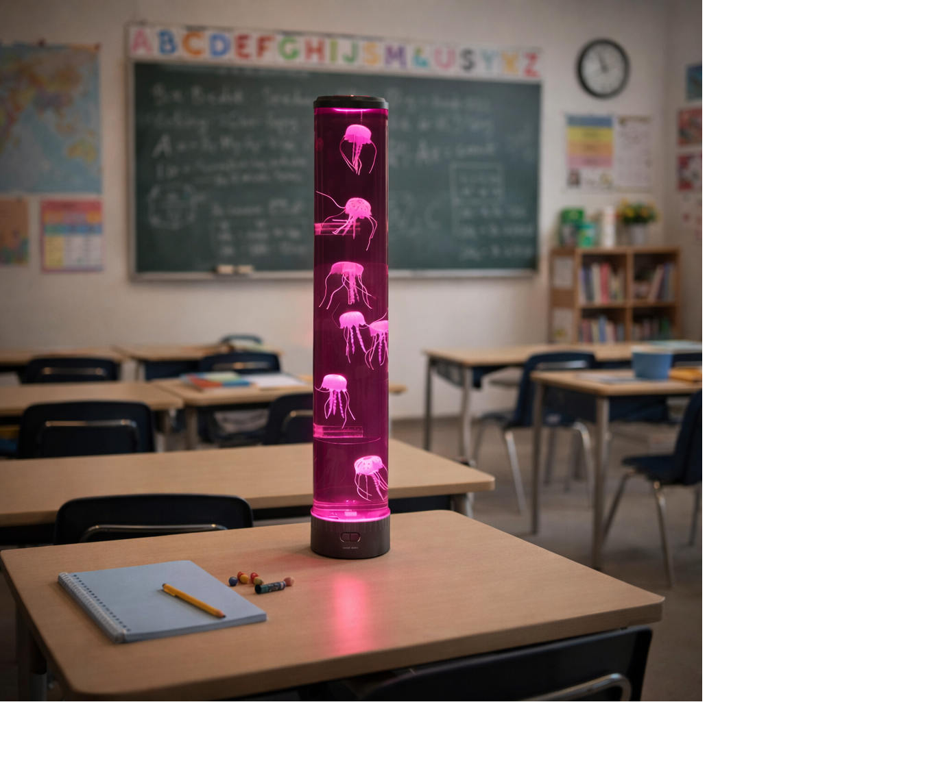 De Sensorische Kwallenlamp van 80 cm is een visueel therapeutisch hulpmiddel dat speciaal is ontworpen om een rustgevende, veilige en ontspannende omgeving te creëren. Het aquariumachtige ontwerp met 7 levensechte kwallen die sierlijk door het water bewegen, biedt een fascinerende sensorische ervaring voor zowel kinderen als volwassenen.