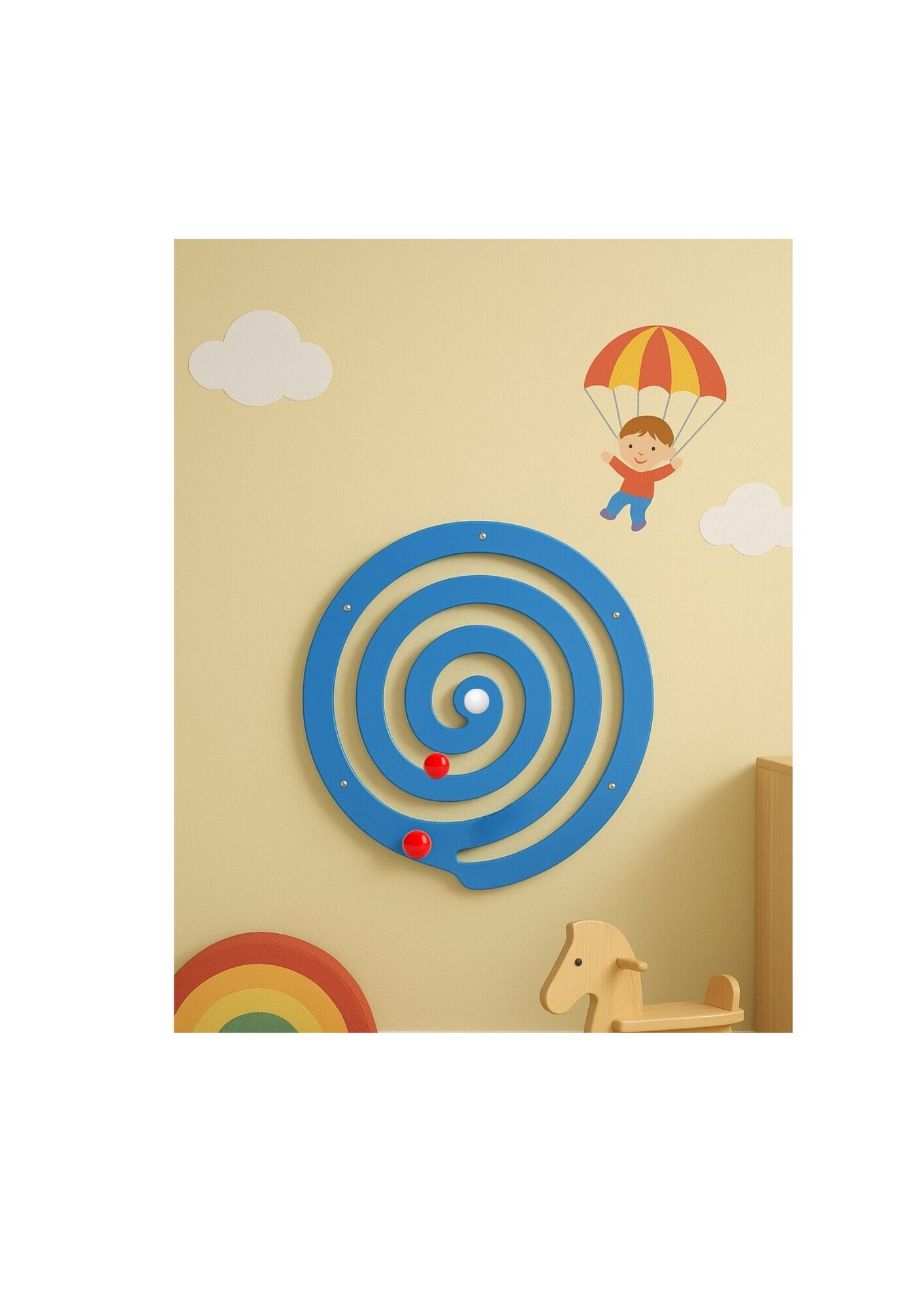 Het Wandpaneel Kogelspiraal Blauw is een spannend en onderhoudsvrij wandspel dat kinderen uitdaagt om de geïntegreerde houten bal door de spiraalbaan naar het midden te leiden. Door het paneel rond de metalen as te draaien, beweegt de bal gecontroleerd naar het centrum. Zodra hij het midden bereikt, rolt hij automatisch terug naar de start – eindeloos speelplezier verzekerd!